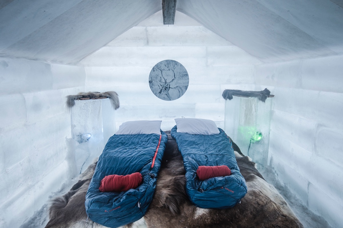 Eishütte - komplett aus Eis jeden Winter neu erbaut, zur Übernachtung gehört ein warmer Thermoschlafsack sowie Rentierfelle. Eine einzigartige Unterkunft, für eine Nacht.