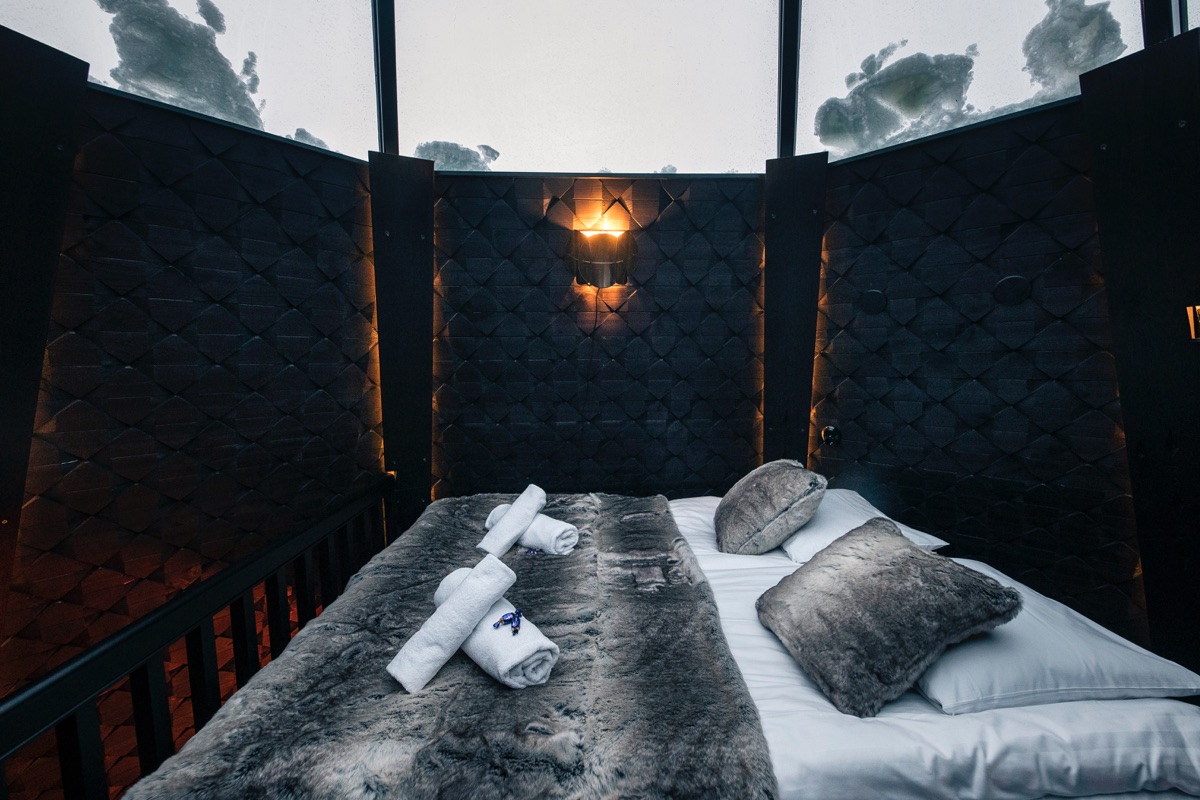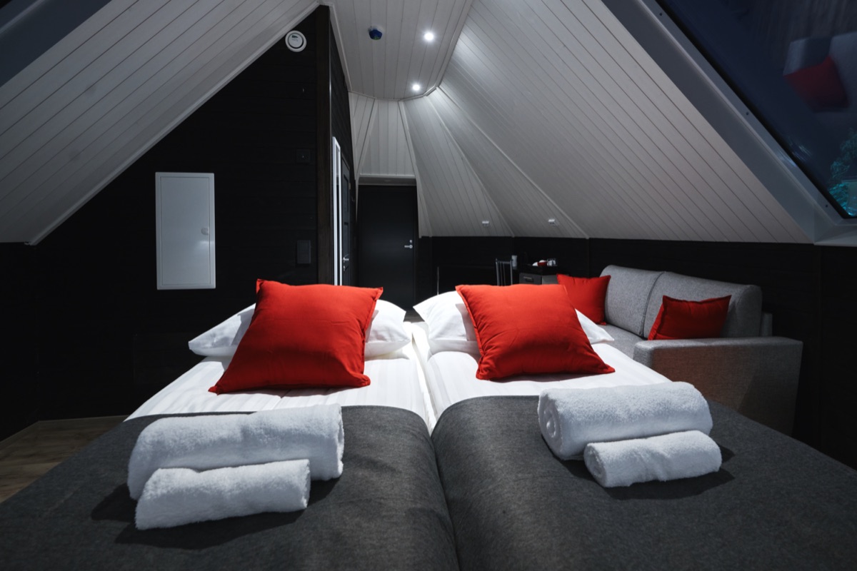 Aurora Ferienhaus mit Glasdach für 2-4 Personen mit ca. 29 m². und in den Varianten, Doppelbett Queen Size oder 2 Einzelbetten und einem Schlafsofa, Badezimmer mit Dusche/ WC, Minibar und Gratis WLAN.