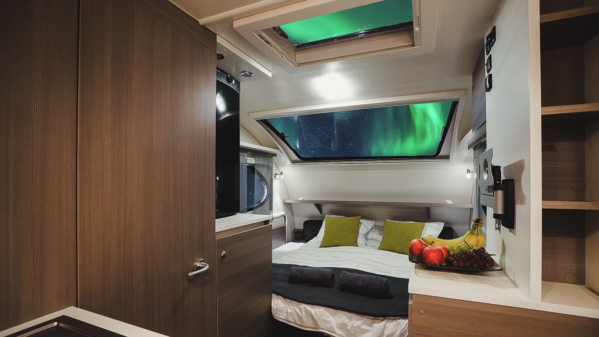 Nordlicht Wohnwagen - ein mobiler Anhänger zum Übernachten. Die kleinen Wagen werden an einen geeigneten Ort in der Wildnis gefahren, haben ein Glasdach über dem Bett und Sie liegen warm und kuschelig unter dem Sternenhimmel. Ausgestattet mit einer kleinen Küchenecke und WC + Waschbecken.