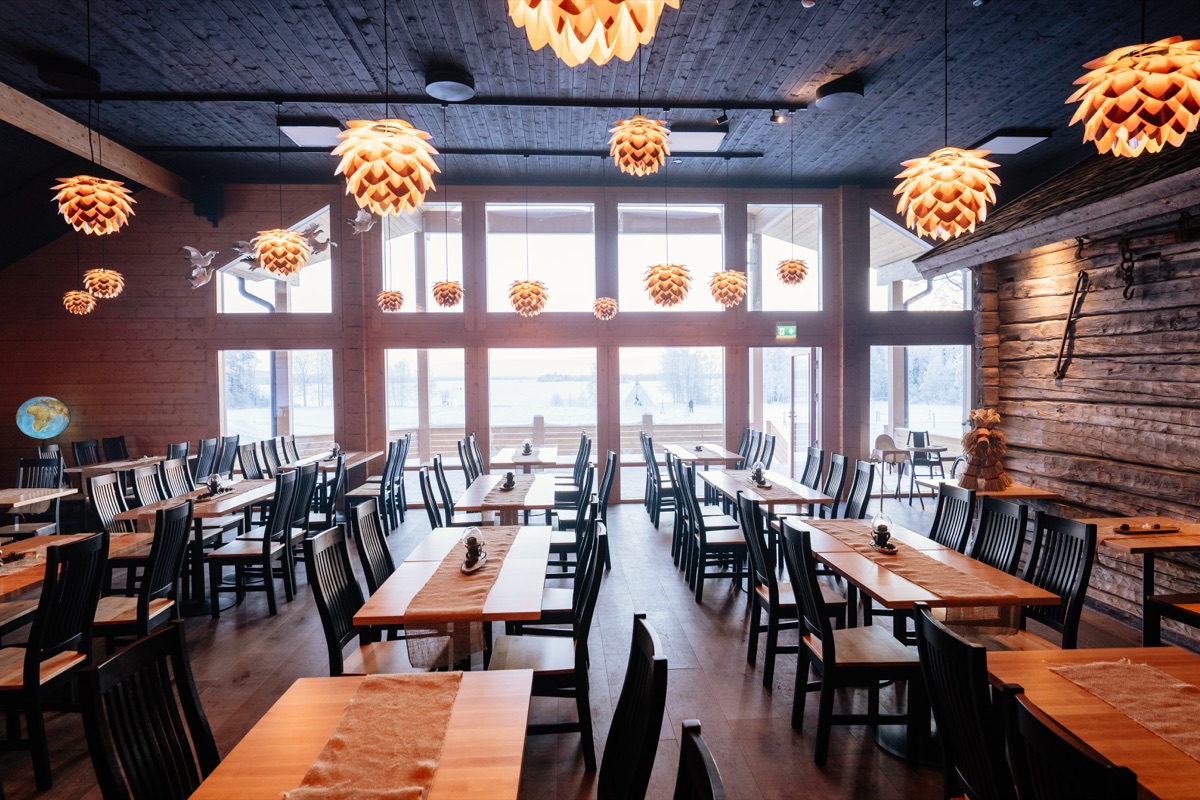 Einrichtungen: Rezeption, Apukka Cafe, Apukka Souvenirshop, Gebäude aus Eis und Schnee auf dem Hotelgelände. Das Apukka Restaurant bietet lokale nordische Küche mit einem gewissen modernen Touch. Im Herzen des Restaurants steht ein riesiger Steinofen, auf welchem Brot und Brötchen direkt frisch gebacken werden und die große Fensterfront bietet einen tollen Blick auf den (gefrorenen) See. Das Abendessen wird in Buffetform serviert.