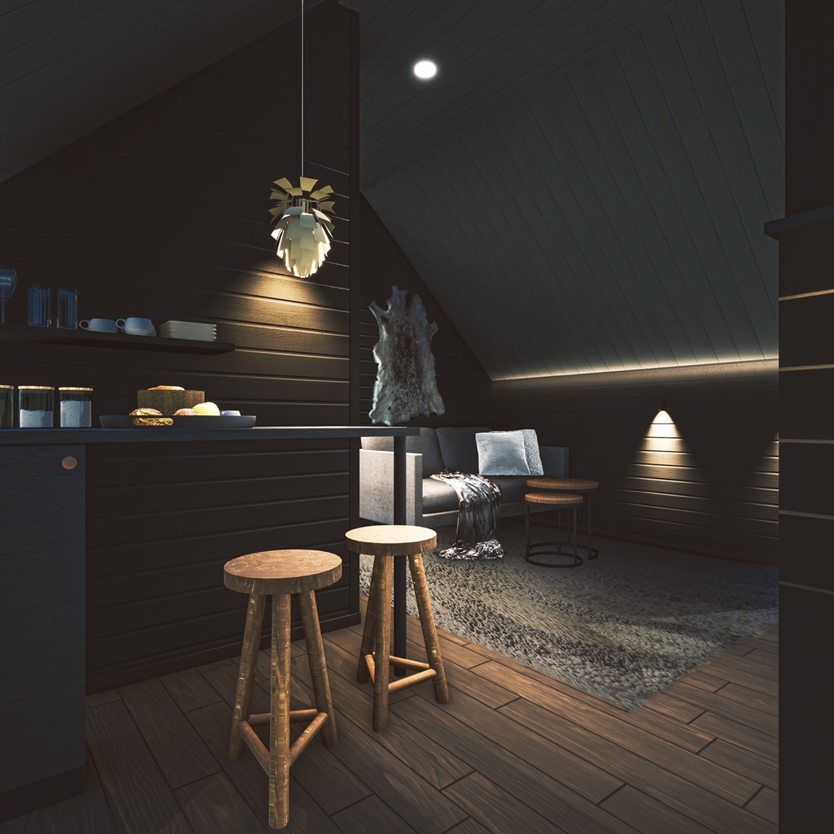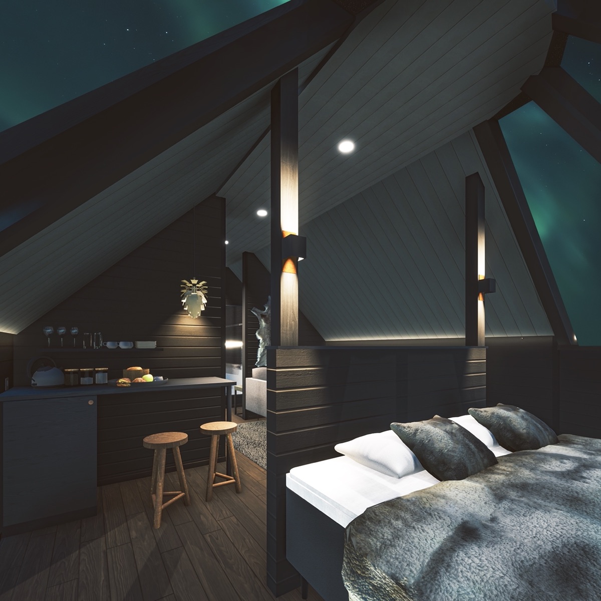Nordlicht Suiten im Kotadesign in 2 Größen, für 2 oder 4 Personen mit ca. 32m² - diese Art der Unterkunft ist etwas ganz besonderes. Die kleine gemütliche Hütte besteht aus 2 Etagen, in der oberen Etage befindet sich nur das Doppelbett direkt unter einem Dach aus Glas. Im unteren Bereich bieten große Fenster eine wunderbare Aussicht. Ausgestattet ist die Hütte mit einer Sitzecke, diese kann in zwei zusätzliche Betten umgewandelt werden, Kamin sowie kleinem Badezimmer mit Dusche und WC.