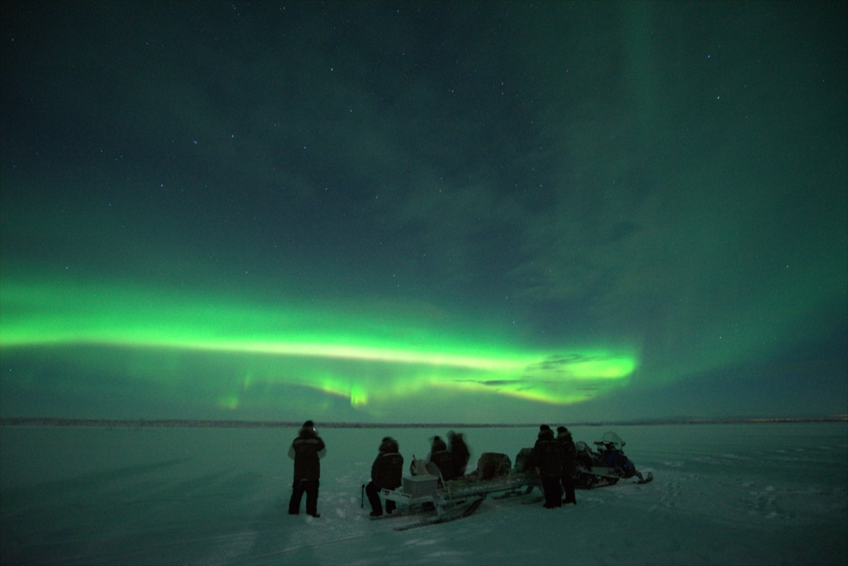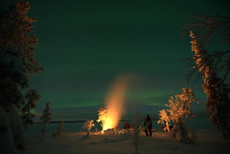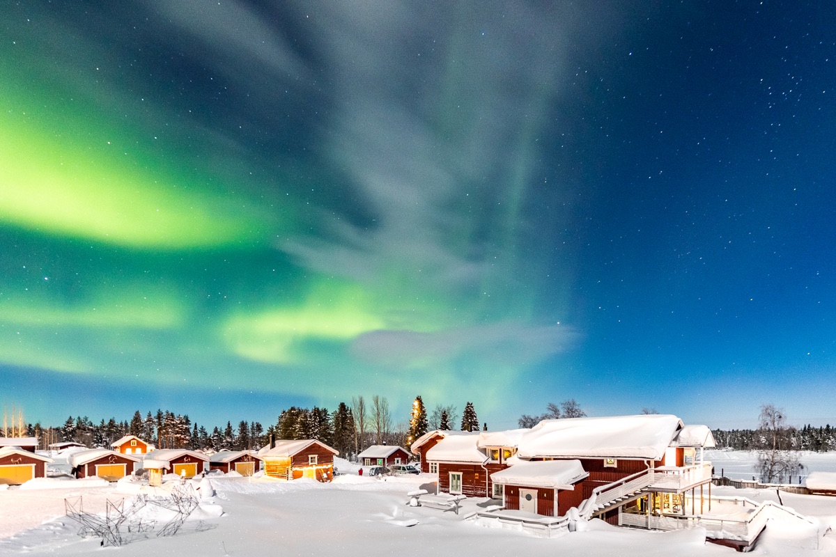 Abends machen Sie es sich in dem großen Schlitten bequem und lehnen sich entspannt zurück. Ihr Schlitten wird an ein Schneemobil angehängt und ein Guide fährt mit Ihnen hinaus in die winterliche Nacht. Genießen Sie die Fahrt und die absolute Dunkelheit ohne jede Lichtverschmutzung und halten Sie die Augen gen Himmel gerichtet. Ihr Guide kennt die besten Plätze zur Nordlichtbeobachtung und steuert einen davon an. Hier machen Sie es sich am Lagerfeuer gemütlich und warten bei einem heißen Getränk darauf, ob sich die Lichter in dieser Nacht zeigen. Auch ohne das Polarlicht werden Sie der Sternenhimmel und die Einsamkeit der schwedischen Wildnis beeindrucken.