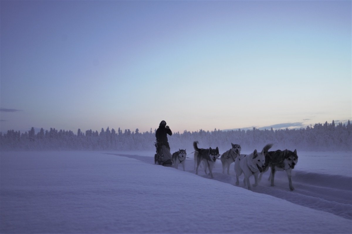 Sie werden zu einer nahegelegenen Huskyfarm gefahren, wo die Hunde Sie schon freudig bellend erwarten. Normalerweise fahren 2 Personen pro Hundeschlitten, einer lenkt den Schlitten, auf den Kufen stehend, während der zweite im Schlitten sitzend die Fahrt genießen kann. Ein Wechsel ist jederzeit möglich. Nach einer Einweisung kann es dann auch schon losgehen und nach kurzer Zeit haben Sie schon ein gutes Gefühl für die Hunde und das Lenken des Schlittens. Nahezu geräuschlos geht es dann durch die verschneite Landschaft, ein einmaliges und unbeschreibliches Erlebnis. Etwa auf halber Strecke machen Sie eine Pause und gönnen sich ein heißes Getränk und einen Snack, bevor es dann zurück zur Farm geht.