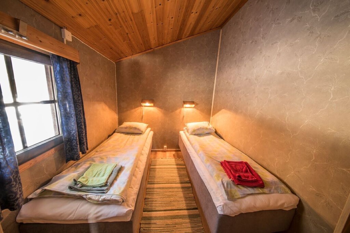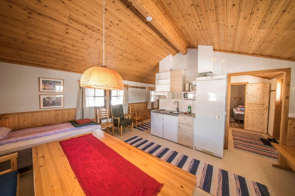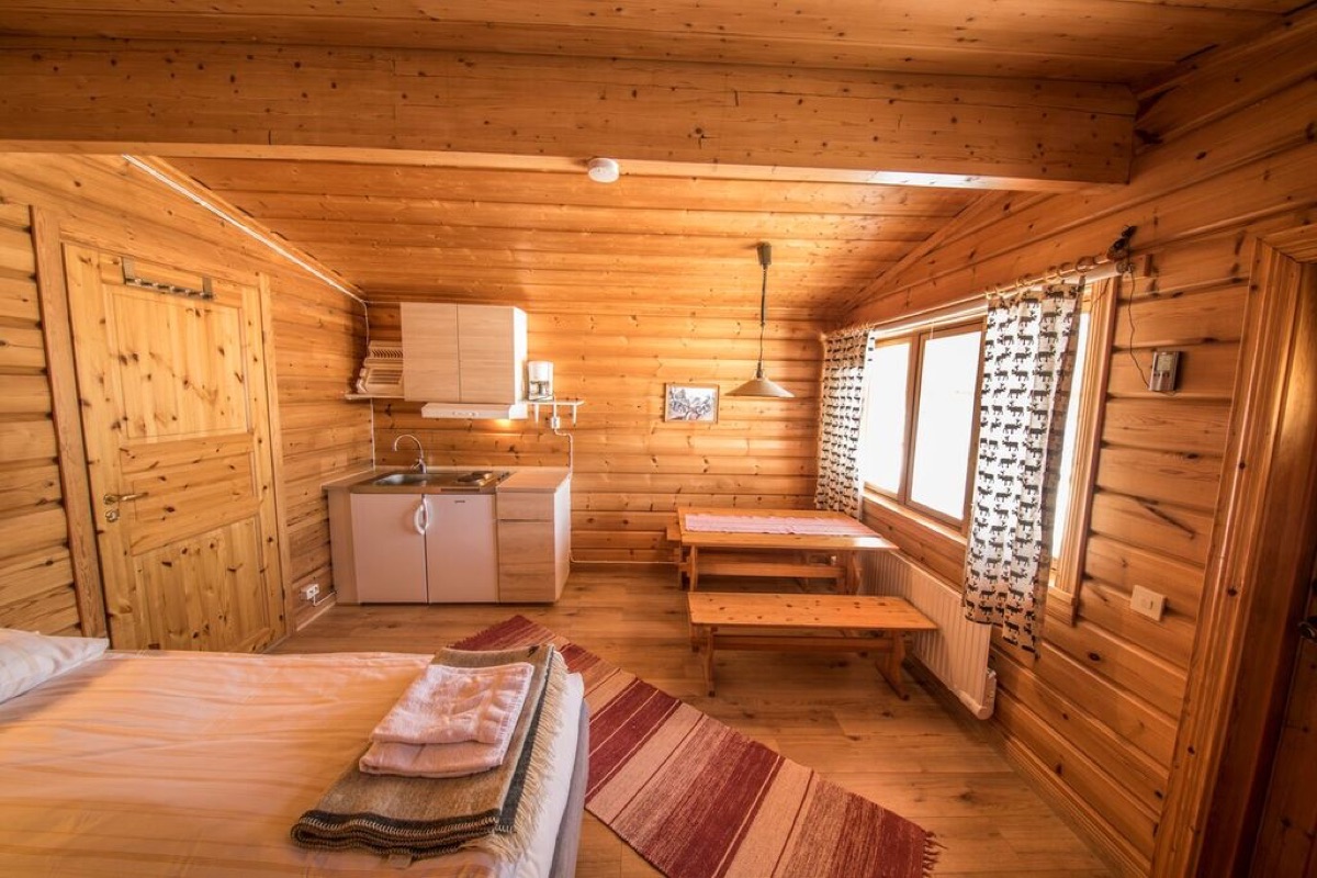 So wohnen Sie: 5 Kleine Blockhütten (25 m²) Einfach und zweckmäßig eingerichtetes Blockhaus, ideal für 2 Personen. Bestehend aus einem kombinierten Wohn-/Schlafraum mit Kochnische, Tisch, 2 Betten, Dusche/WC sowie Trockenschrank für Winterkleidung. Handtücher und Bettwäsche sind vorhanden sowie WLAN.