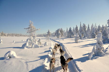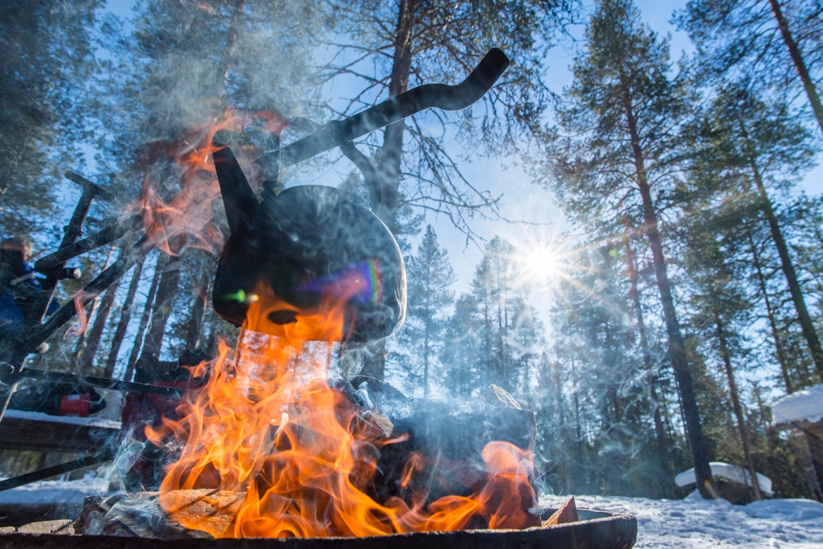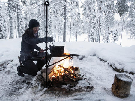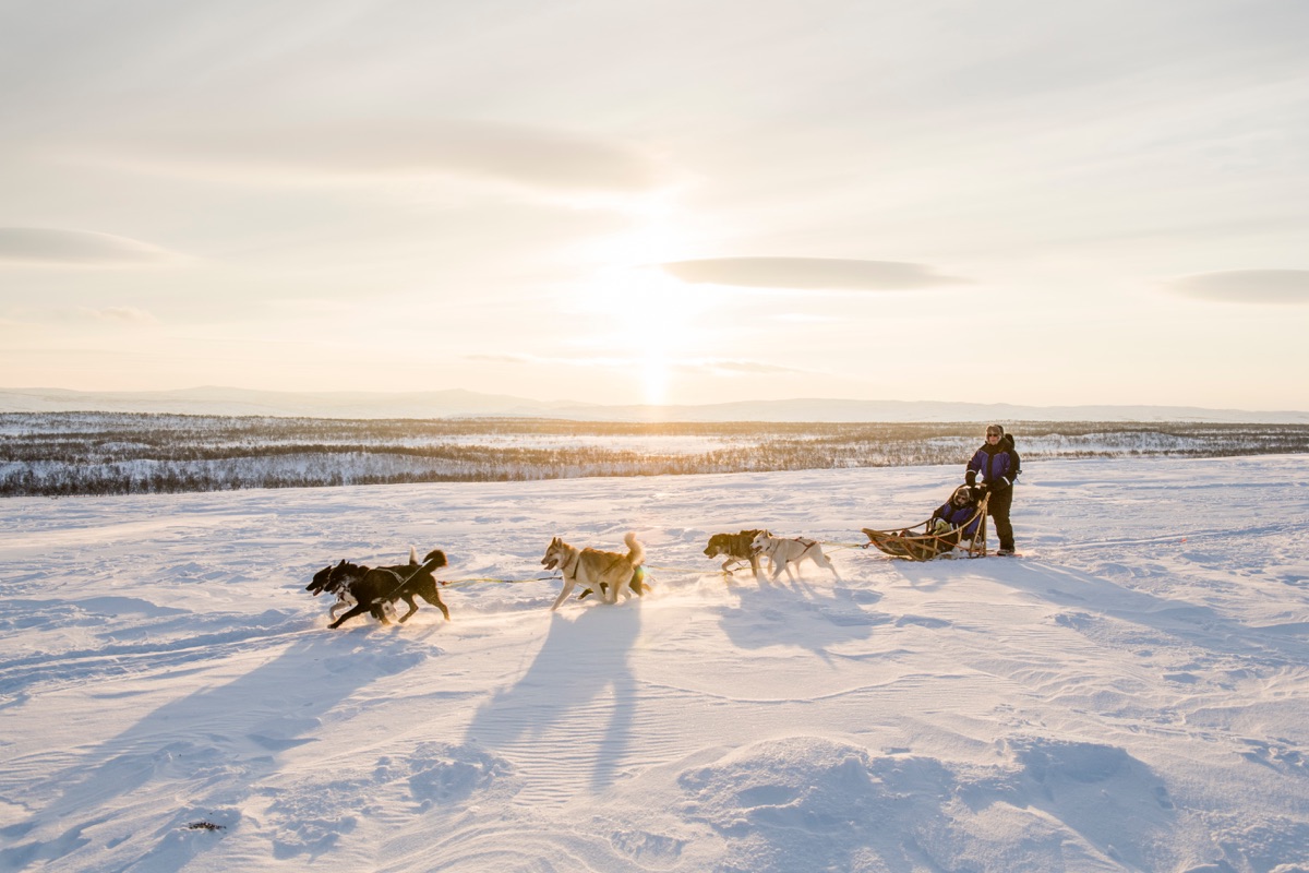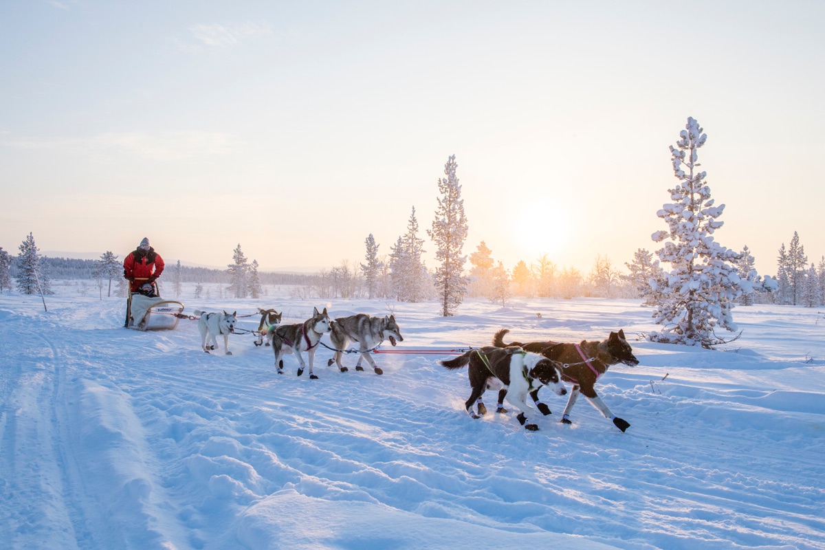 Die Kufen gleiten nahezu lautlos über den Schnee, hinein in den Riisitunturi-Nationalpark, berühmt für seine schneebeladenen Bäume – hier fühlt man sich wie mitten in einer Postkarte. Nach einem stärkenden Mittagslunch vom Feuer führt die Fahrt weiter zu einer abgelegenen, holzbeheizten Wildnishütte. Wasser stammt aus dem See, Strom für Licht und das Aufladen von Handys liefert ein Solarpanel. Am Abend helfen Sie gemeinsam mit Lauri bei der Pflege der Hunde, bevor Sauna und Abendessen auf Sie warten.
