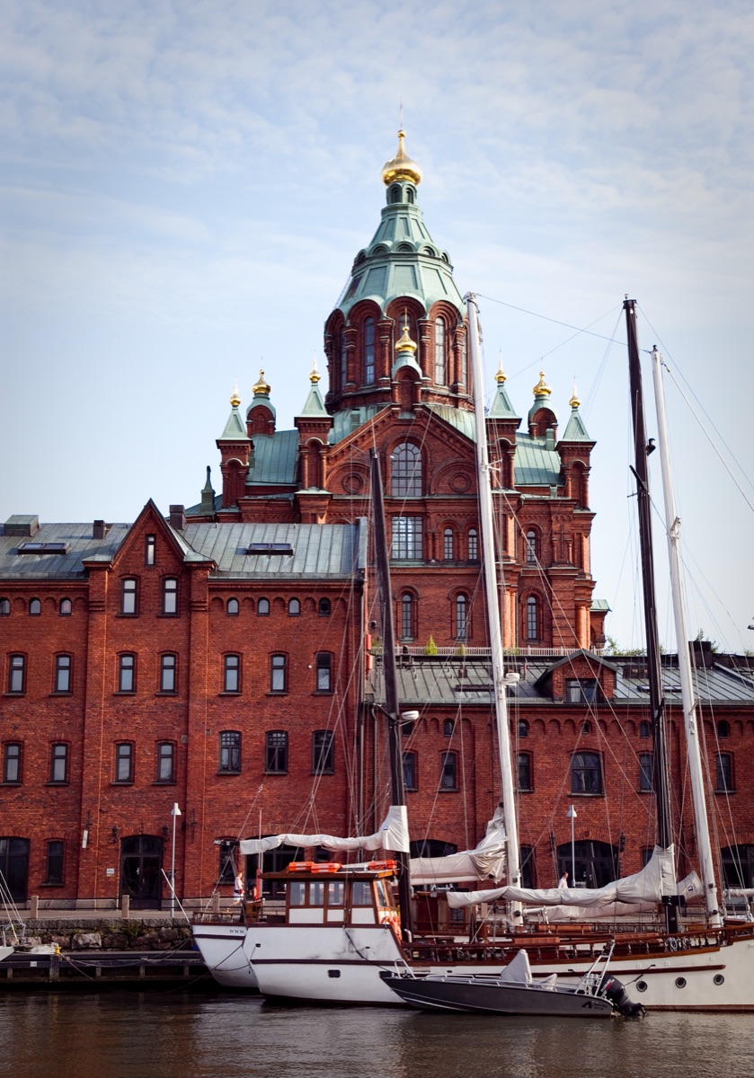 Geradezu majestätisch erhebt sich die die Uspenski-Kathedrale auf dem Hügel Katajanokka in der Nähe des Stadtzentrums von Helsinki. Von hier aus hat man einen beeindruckenden Blick auf den Hafen und die umliegenden Stadtteile. Die orthodoxe Kirche in Finnland, mit Wurzeln im 12. Jahrhundert, spielt eine bedeutende Rolle im religiösen und kulturellen Leben des Landes und umfasst drei Diözesen, darunter die Diözese Helsinki.