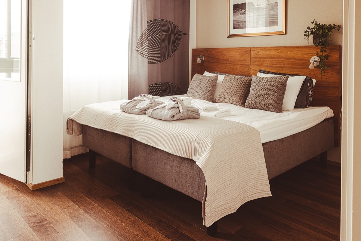 So wohnen Sie: Im Hotel stehen insgesamt 42 Zimmer in drei verschiedenen Kategorien zur Verfügung: Standard Zweibettzimmer, geräumige Superior Zweibettzimmer und die exklusive Mini-Suite, die auch als Hochzeitssuite bekannt ist. Jedes Zimmer ist im ansprechenden skandinavischen Stil gestaltet und bietet ein eigenes Badezimmer mit WC und Dusche, einen Flachbild-TV, Bettwäsche, Handtüchern und eine Klimaanlage. Die Superior Zimmer befinden sich in der fünften Etage und sind zusätzlich mit einem Wasserkocher, Bademänteln und Hausschuhen ausgestattet und verfügen über einen privaten Balkon zur Fußgängerzone. Die Mini-Suite besteht aus einem Schlafzimmer und einem gemütlichen Wohnbereich und verfügt über die gleiche Annehmlichkeiten wie die Superior Zimmer. WLAN steht im gesamten Hotelbereich zur Verfügung. Einige Zimmer sind speziell für Menschen mit Beeinträchtigungen angepasst, und in einigen Zimmern sind Haustiere erlaubt.