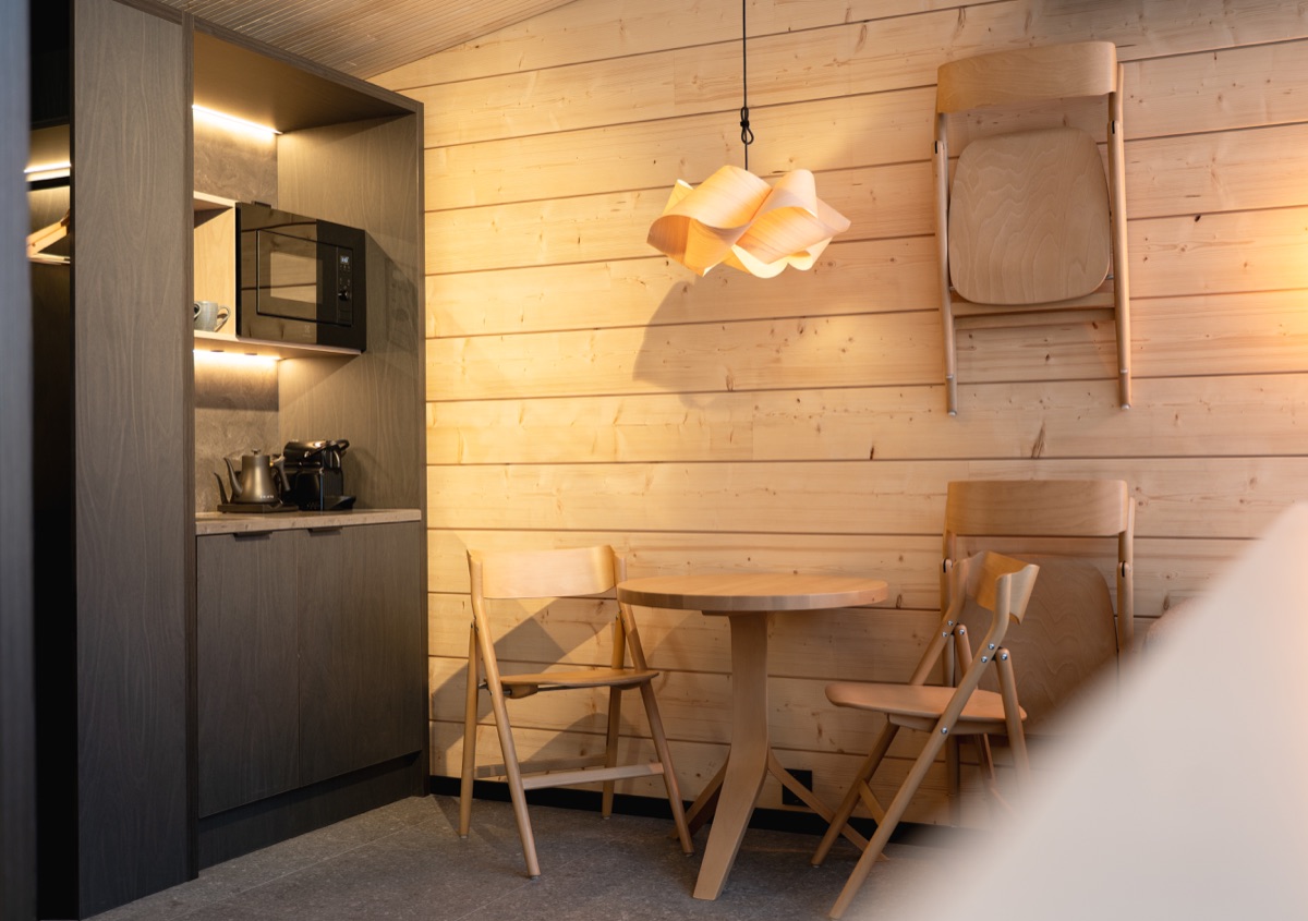 Zusätzlich gibt es Panorama-Hütten, die ruhig in einem kleinen Wald nahe dem Hotel liegen. Auf etwa 30 m² bieten sie ein Doppelbett, eine gemütliche Sofaecke (für 1–2 weitere Personen), einen Tisch mit Kitchenette (Kühlschrank, Mikrowelle, Kaffeemaschine, Wasserkocher, Geschirr) sowie ein Bad mit Dusche/WC. Große Fenster öffnen den Blick auf den Wald und die Natur rund um den Jerissee.